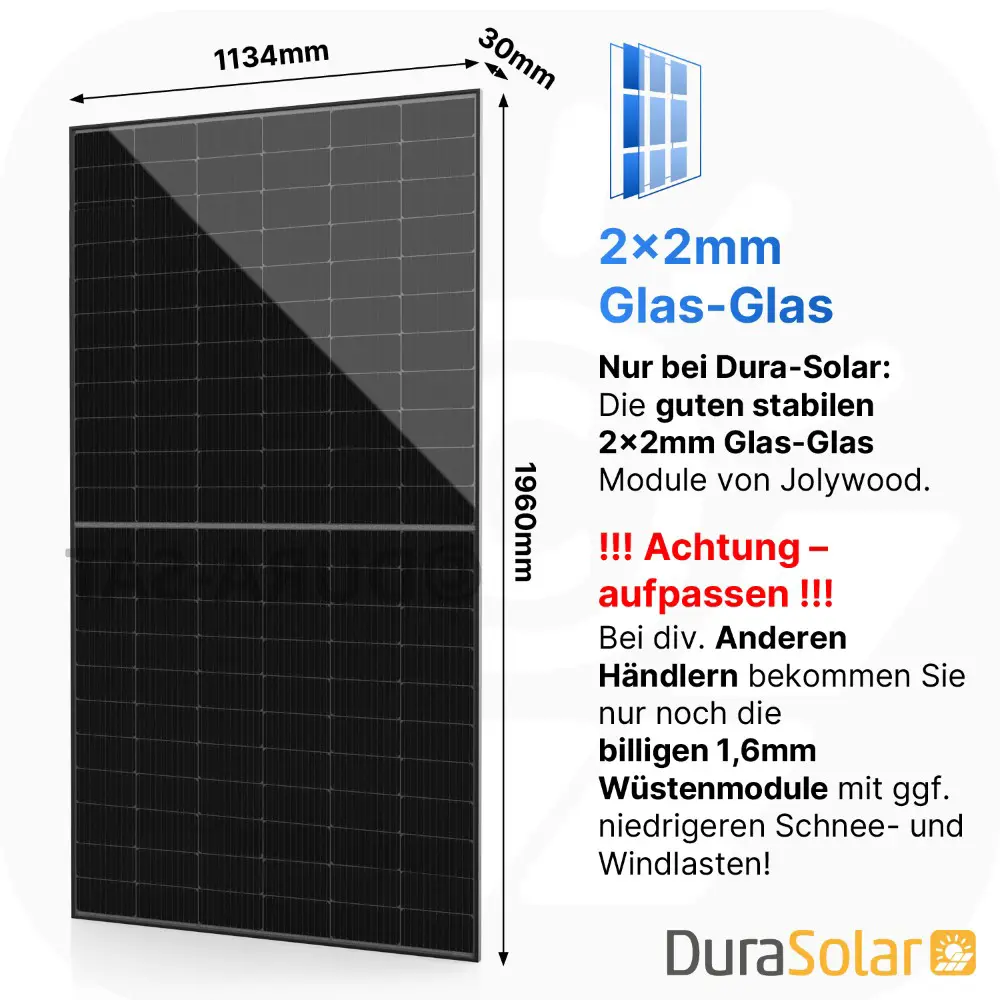 - 2000 Wp mit 4x 500 W Jolywood-Modulen – Bifaziale Hochleistungs-Solarmodule in Full-Black-Optik für maximale Energieausbeute, auch bei diffusem Licht.