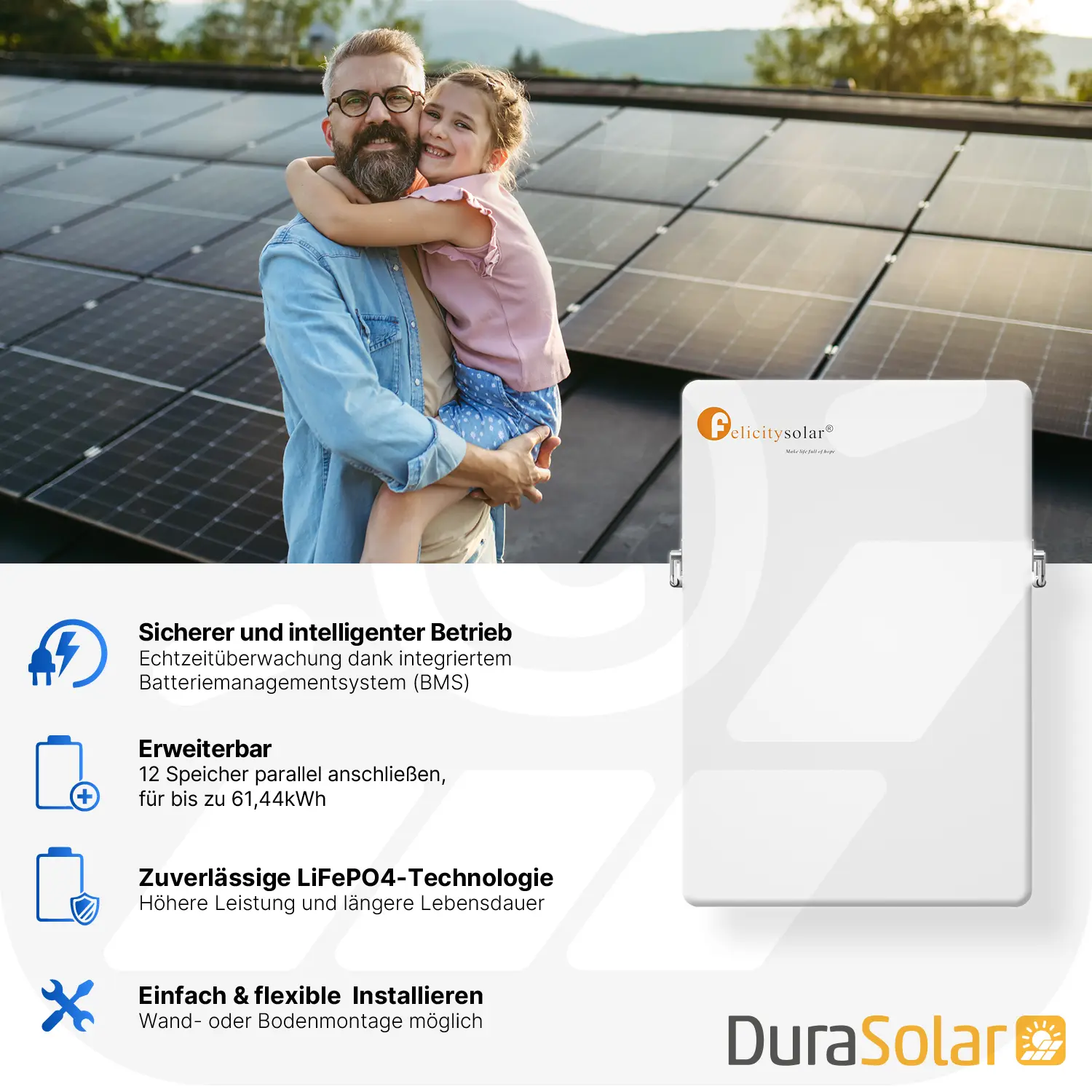 Der Speicher bietet eine zuverlässige Energiespeicherlösung für unterschiedliche Einsatzbereiche. Dank fortschrittlicher LiFePO4-Technologie zeichnen sich die Speicher-Serie durch eine hohe Energiedichte, lange Lebensdauer und maximale Sicherheit aus. Das eingebaute BMS-System überwacht kontinuierlich den Zustand der Batterie und sorgt für eine maximale Betriebssicherheit. Zusätzlich sind weitere Sicherheitsmechanismen wie Schutzschalter und Sicherungen vorhanden für einen verlässlichen Betrieb. Der Speicher unterstützt sowohl Wand- als auch Bodenmontage und bietet auch eine breite Kompatibilität mit gängigen Wechselrichtermarken.
