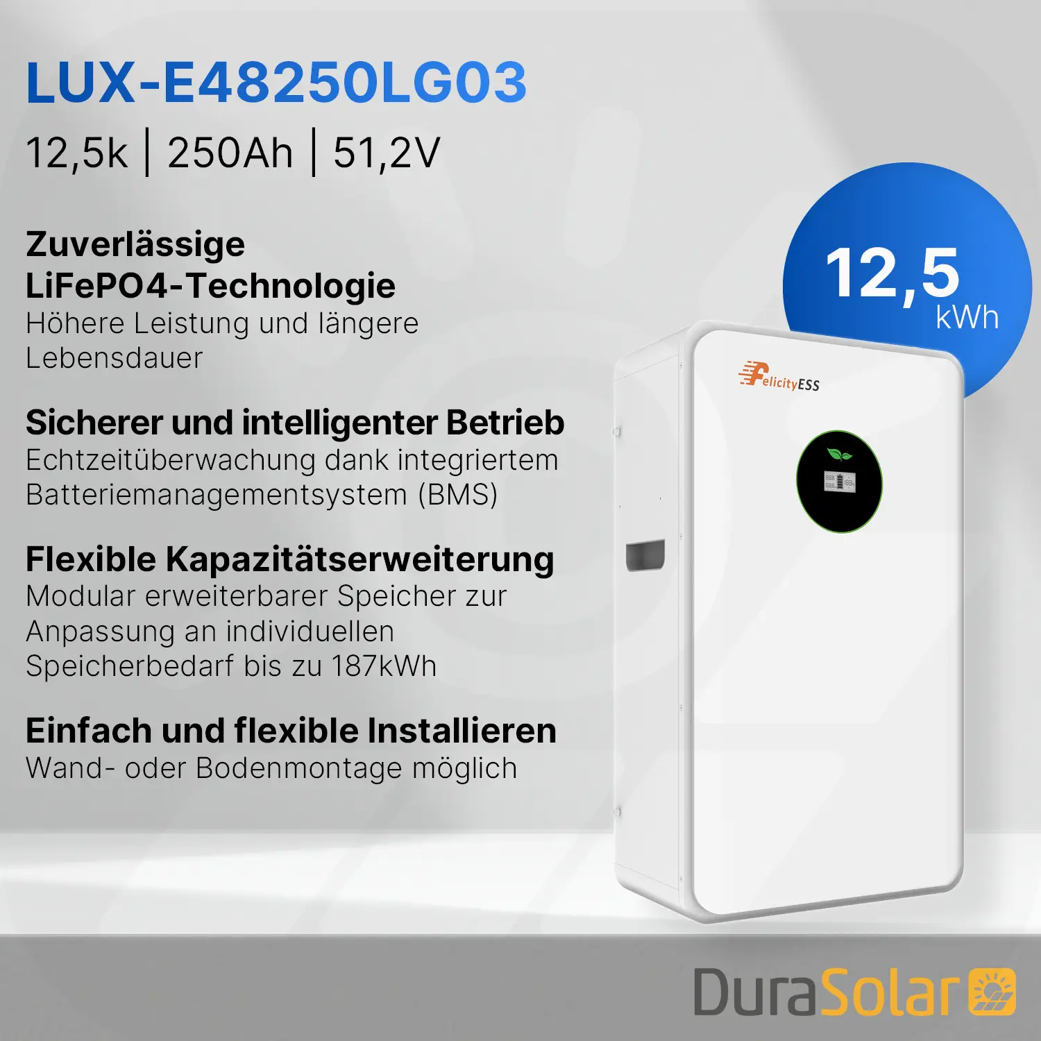 Felicity - 12,5kWh PV-Speicher - LUX-E-48250LG03 - Erweiterbare 48/51,2V LiFePO4 Batterie für Solaranlagen