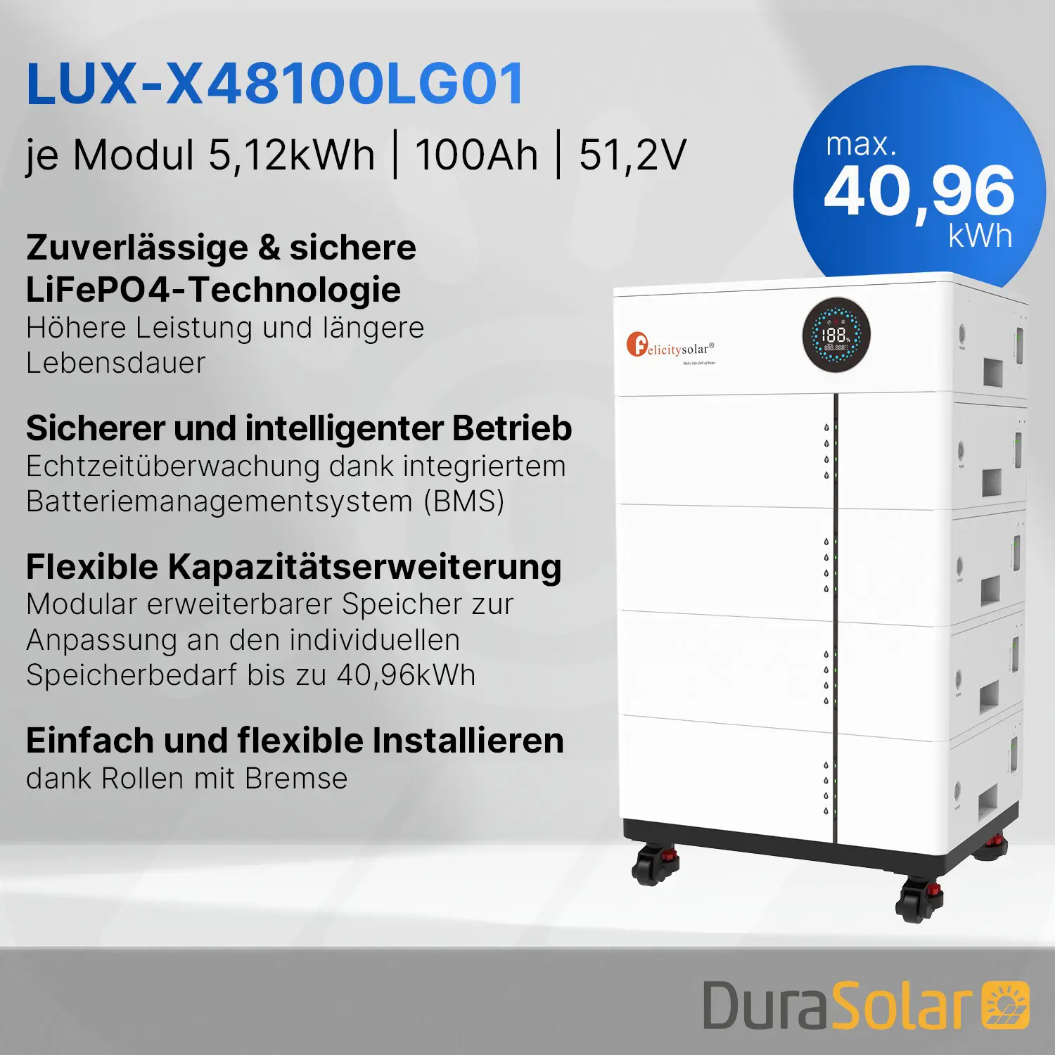 Felicity 15,36kWh PV-Speicher - LUX-X-48100LCG01 - Erweiterbare 48/51,2V LiFePO4 Batterie für Solaranlagen