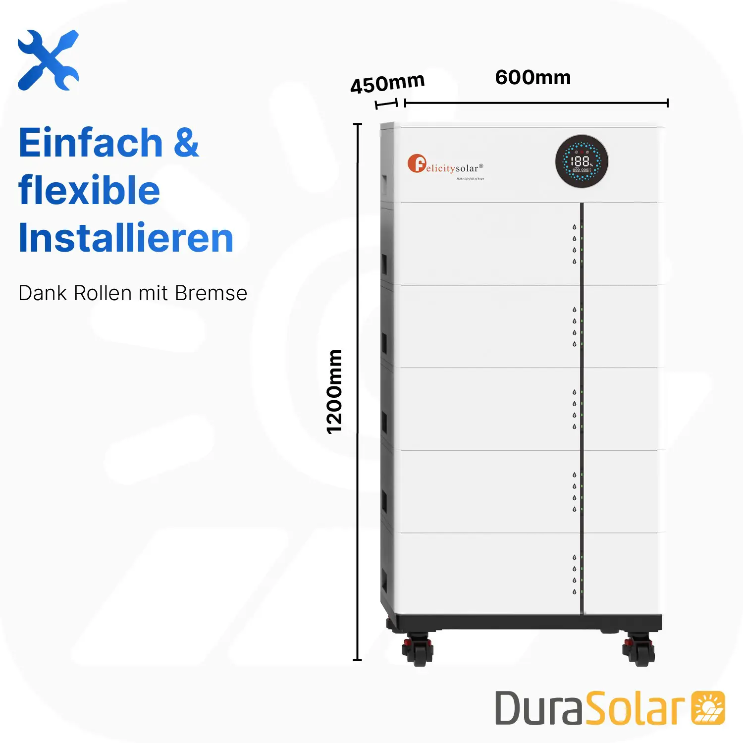 Das platzsparende Design und die Rollen mit Bremsfunktion macht die Installation besonders einfach und sorgt für eine unkomplizierte Ausrichtung.