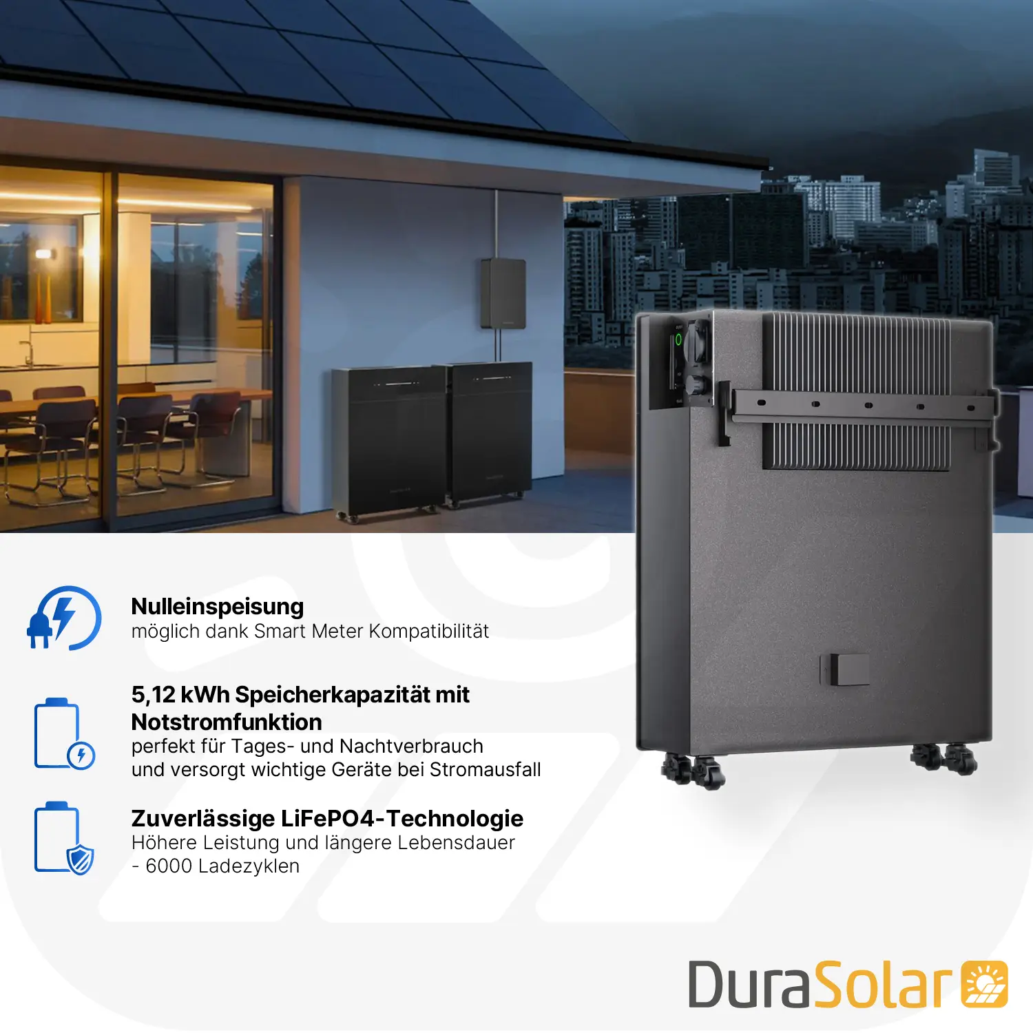 Der Marstek Venus E ist ein leistungsstarker, AC-gekoppelter Solarspeicher mit einer nutzbaren Kapazität von 5,12 kWh, der sich nahtlos in bestehende PV-Systeme und Balkonkraftwerke integrieren lässt. Somit ist das Nachrüsten von Balkonkraftwerken und bestehenden PV-Anlagen besonders einfach. Dank Plug-and-Play-Design ist der Speicher sehr leicht zu installieren.