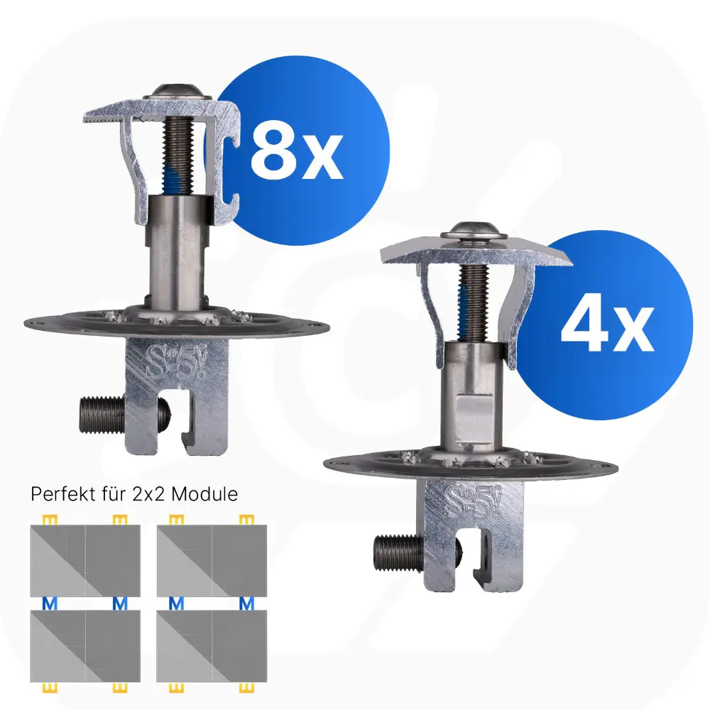 - Mittel und Endmodulklemmen inklusive Modulauflagescheiben aus Edelstahl und Erdungszähnen