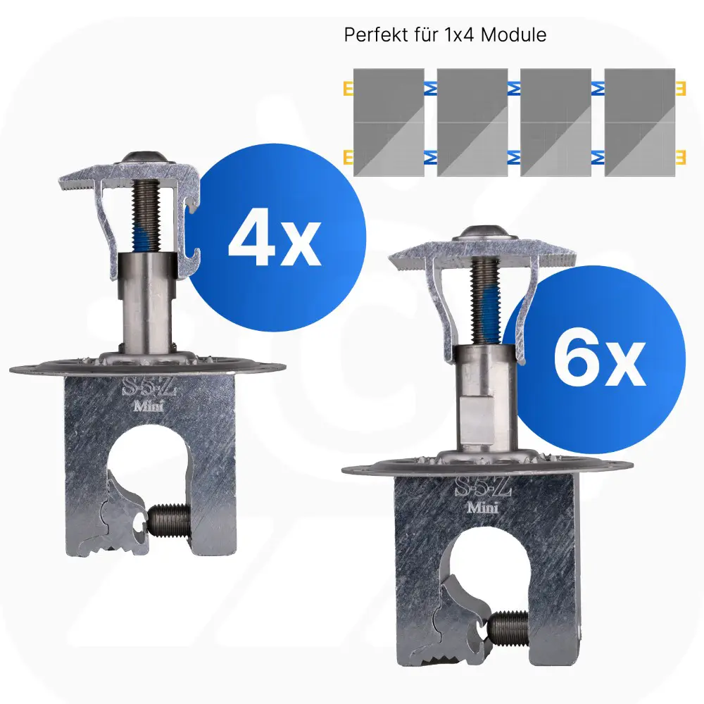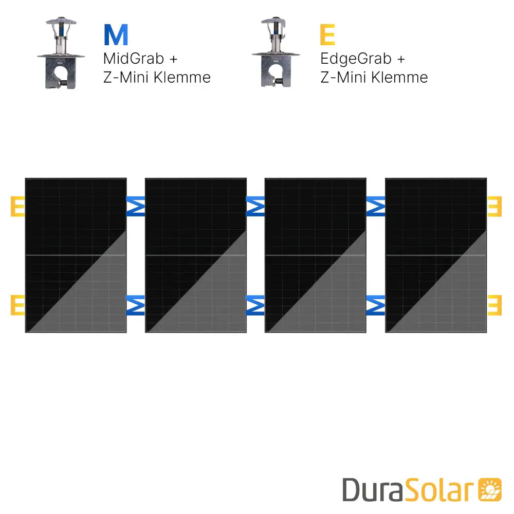 - Mittel und Endmodulklemmen inklusive Modulauflagescheiben aus Edelstahl und Erdungszähnen