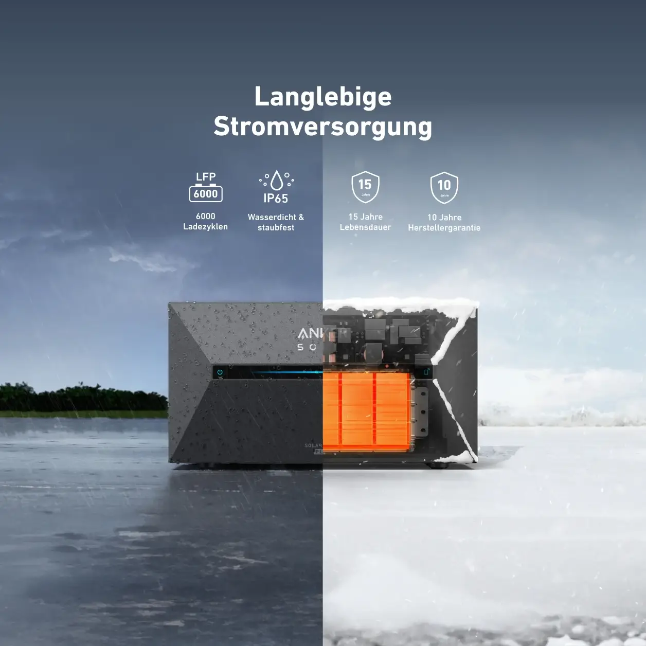 - Lange Lebensdauer & hohe Zuverlässigkeit: Profitier von 6000 Ladezyklen und einer Lebensdauer von bis zu 15 Jahren – die Anker Solix Solarbank 2 ist auf Langlebigkeit ausgelegt.