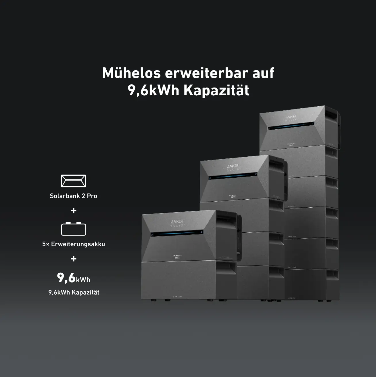 - Modular erweiterbar: Erweitere die Kapazität mit bis zu 5 Erweiterungsbatterien auf bis zu 9,6 kWh – so passt sich die Solarbank perfekt deinem Bedarf an.