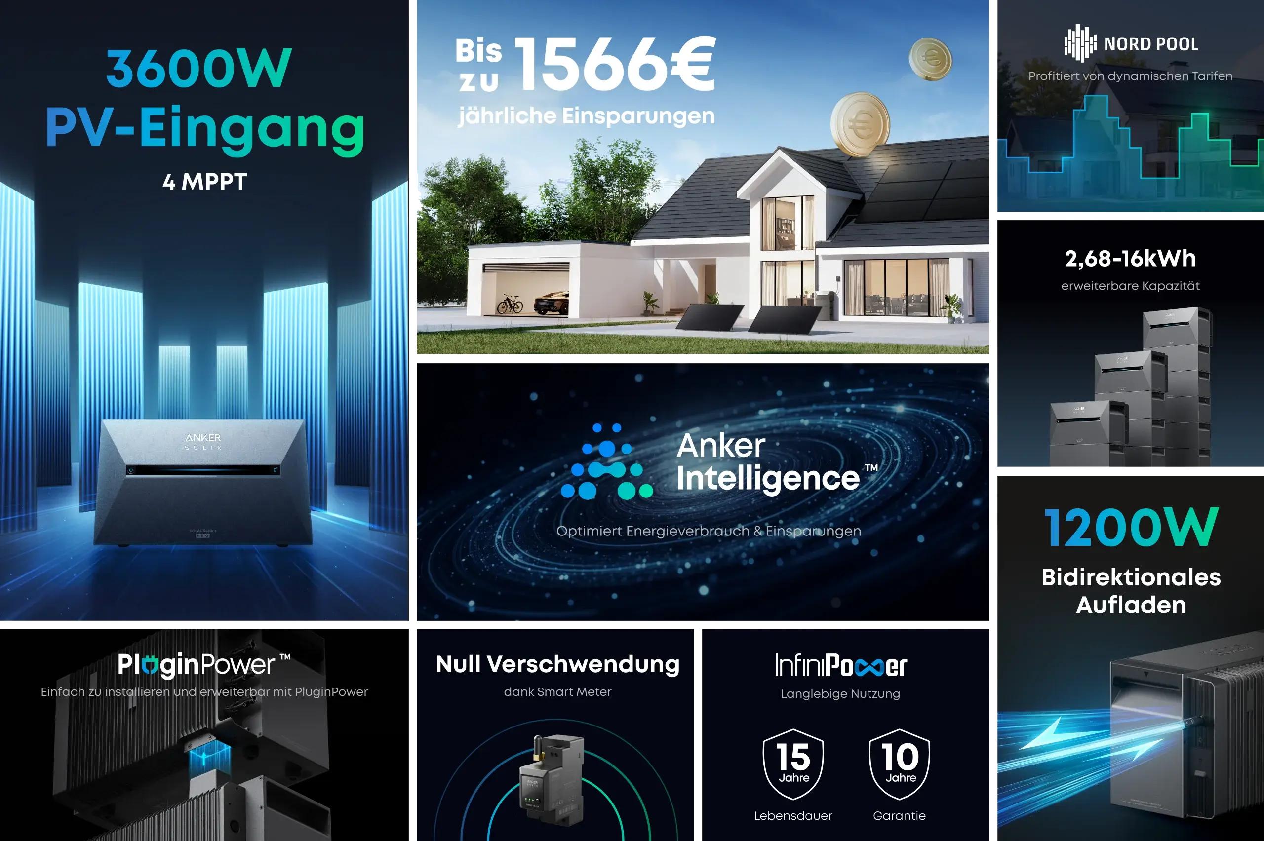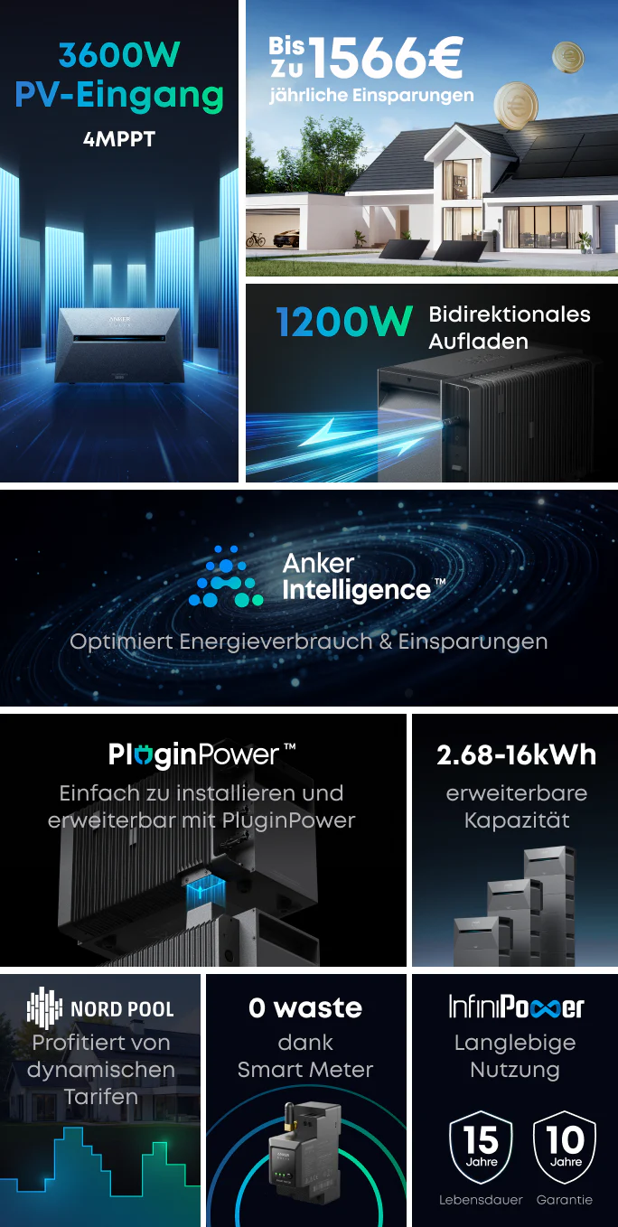 Dank AnkerIntelligence™, dem KI-gestützten Energiemanagement, optimiert das System deinen Stromverbrauch. Wetterdaten, Verbrauchsverhalten und dynamische Stromtarife (NordPool) werden analysiert, um Einspeisung und Speicherung automatisch anzupassen.