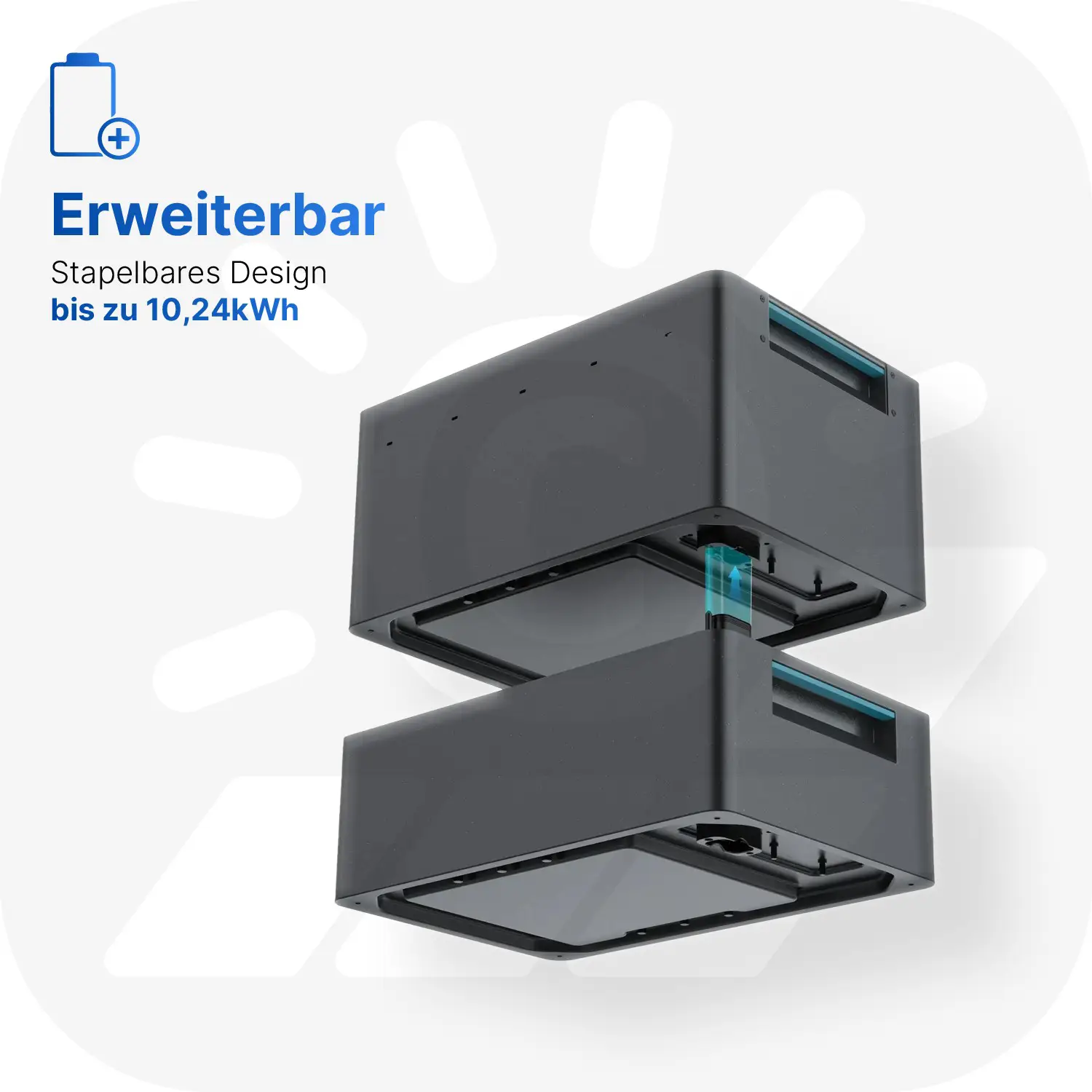 • Modularer Erweiterungsspeicher für Marstek Jupiter C+ (ab 5,12kWh) Erweiterungsmodul: 2,56 kWh | Die Anzahl der enthaltenen Speichermodule richtet sich nach der gewählten Gesamtkapazität