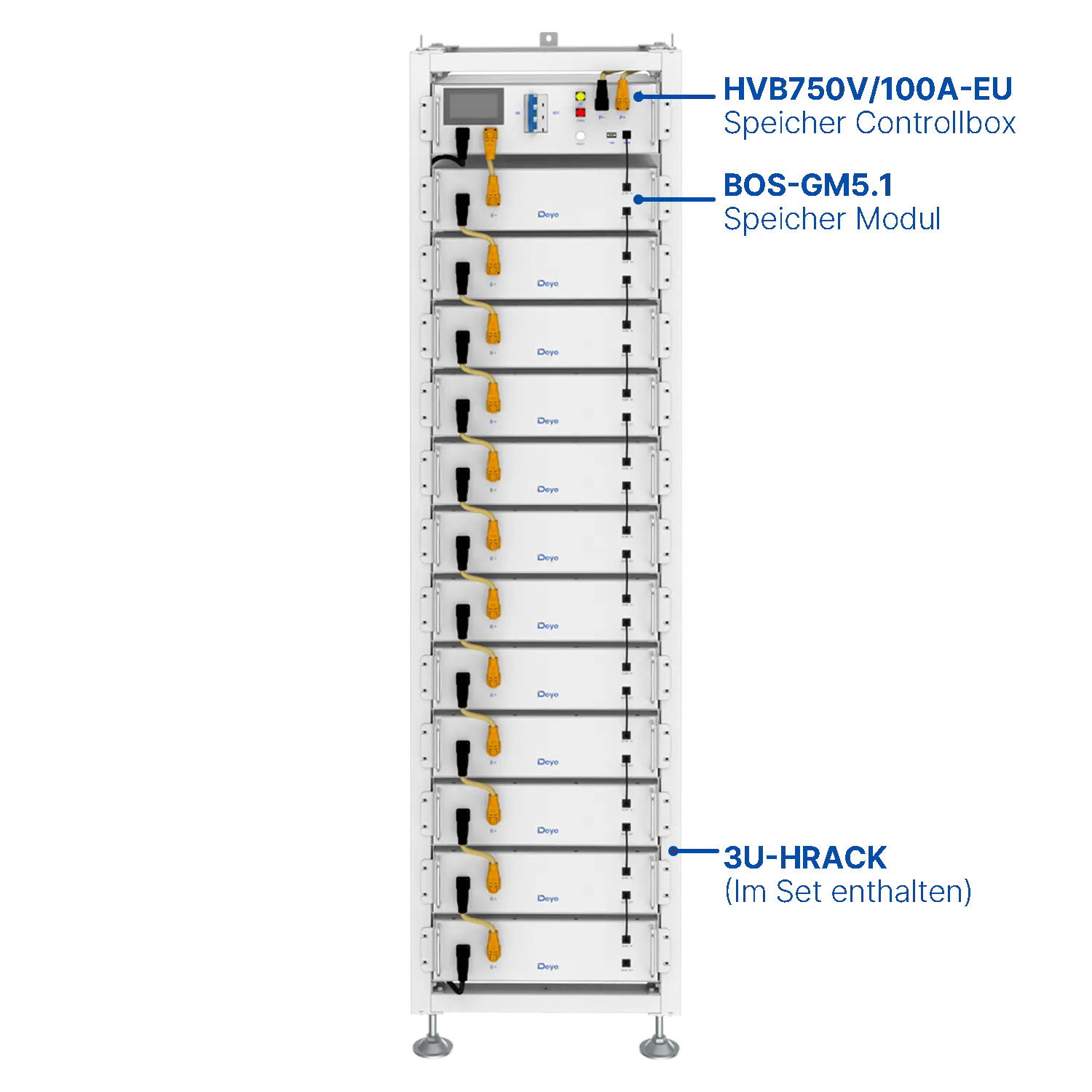 Das BOS-G-Speicher Set nutzt fortschrittliche LiFePO4-Zelltechnologie, bekannt für ihre hervorragende thermische Stabilität, hohe Zykluslebensdauer und exzellentes Sicherheitsprofil. Jedes Batteriemodul hat eine nominale Kapazität von 100Ah und eine Energie von 5,12 kWh, was es Ihnen ermöglicht, Ihr System entsprechend Ihren Energiespeicheranforderungen zu skalieren.