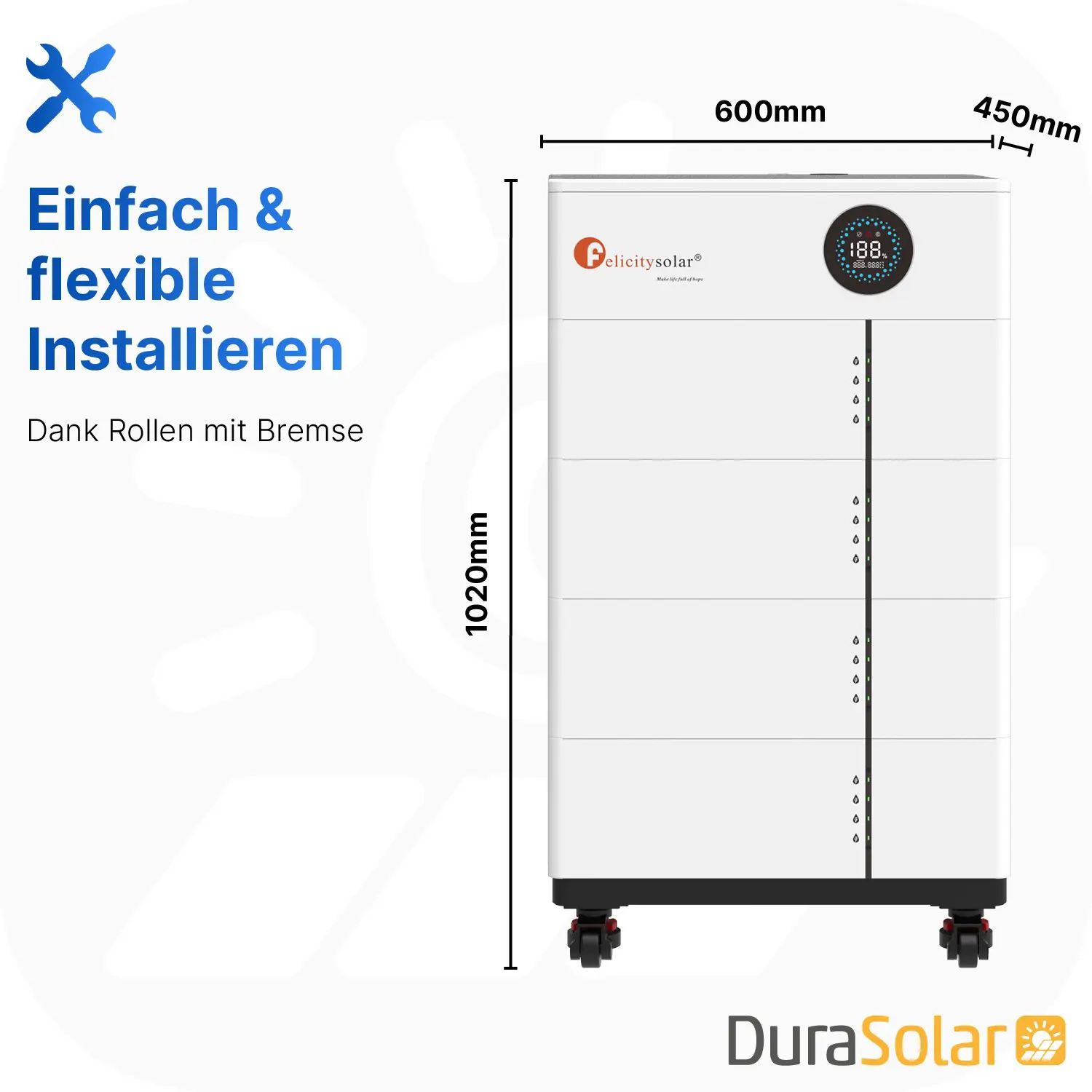 Das platzsparende Design und die Rollen mit Bremsfunktion macht die Installation besonders einfach und sorgt für eine unkomplizierte Ausrichtung.