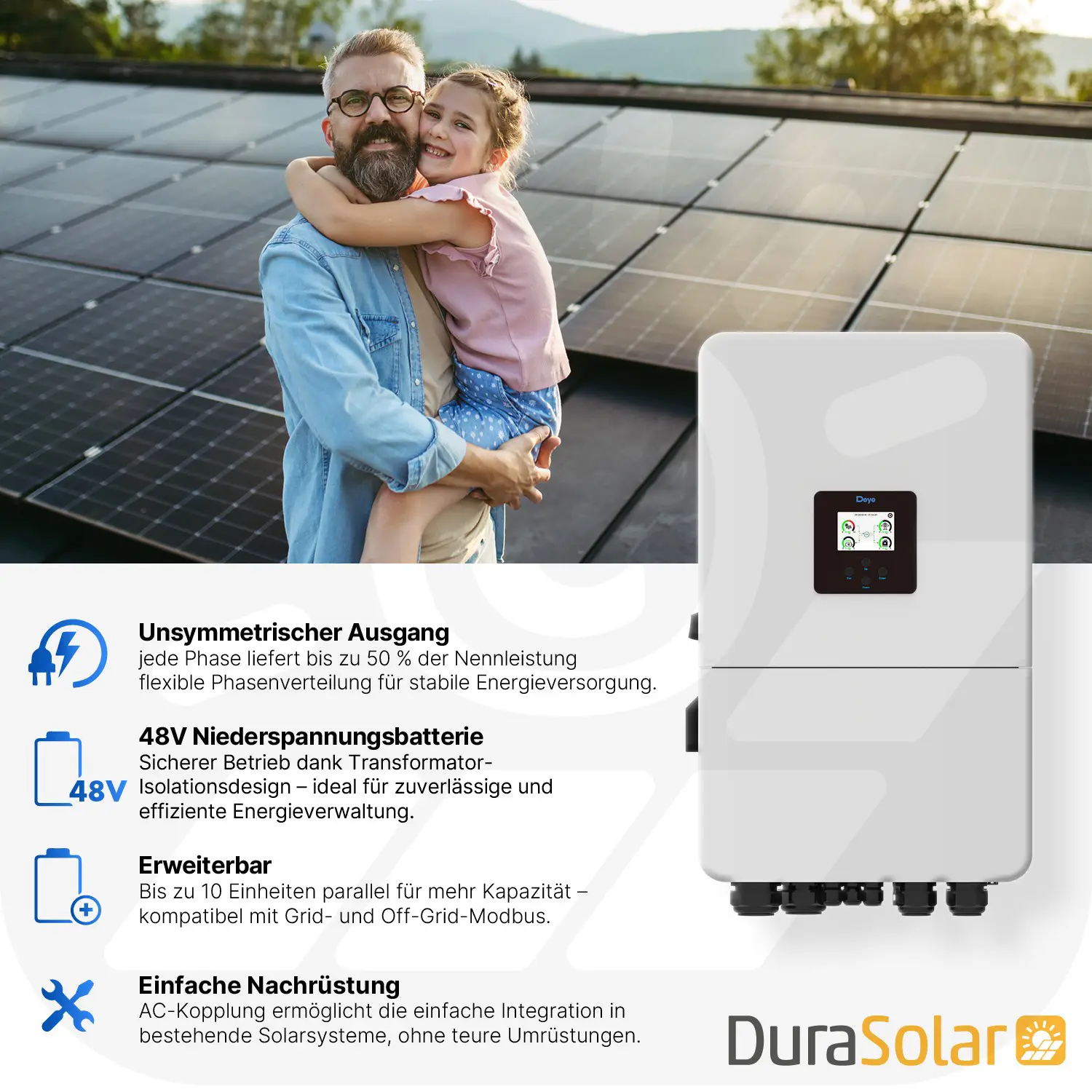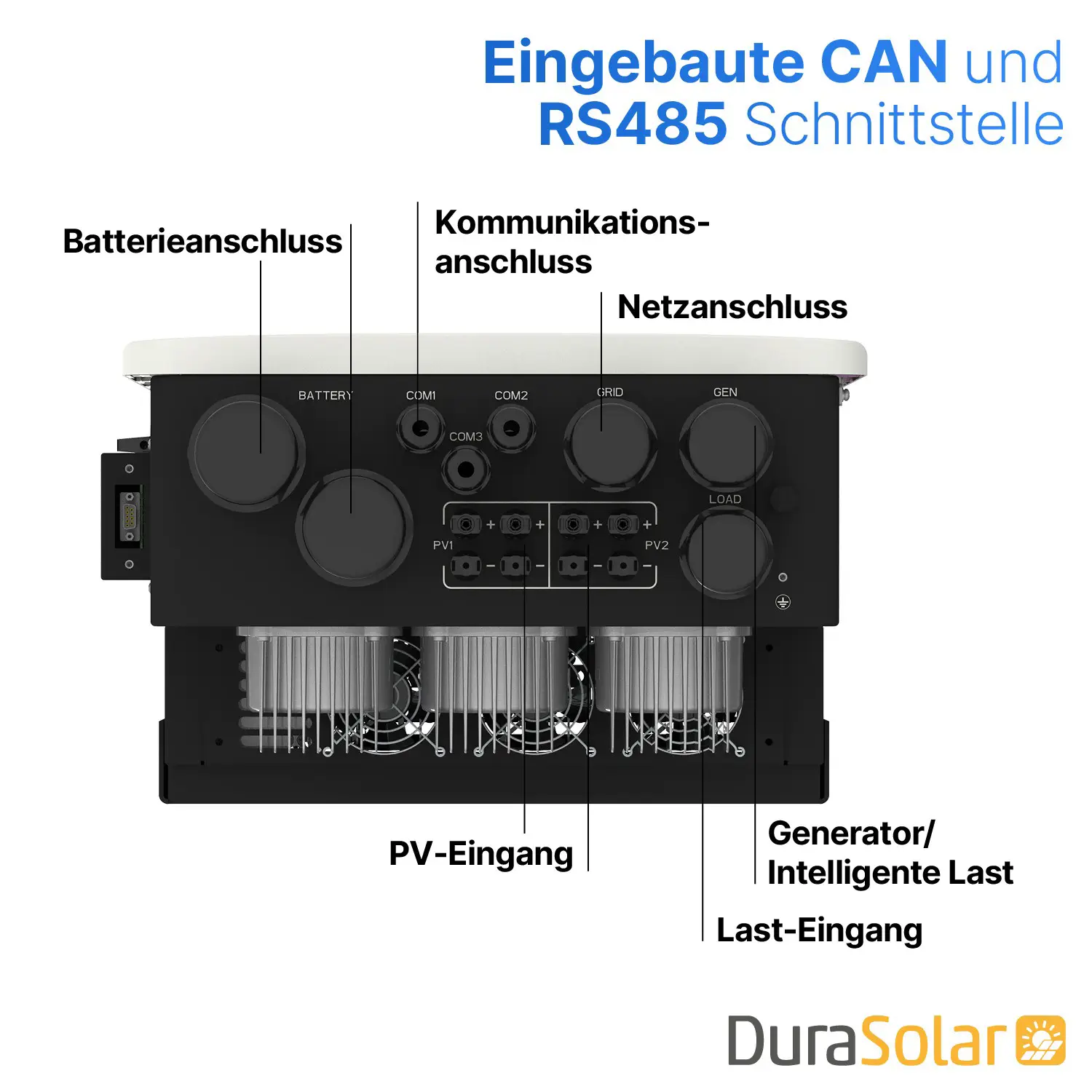 Der Hybrid-Wechselrichter ist ein Hochleistungsgerät, das sich durch seine niedrige Batteriespannung von 48 V und ein hervorragend isoliertes Transformator-Design auszeichnet.