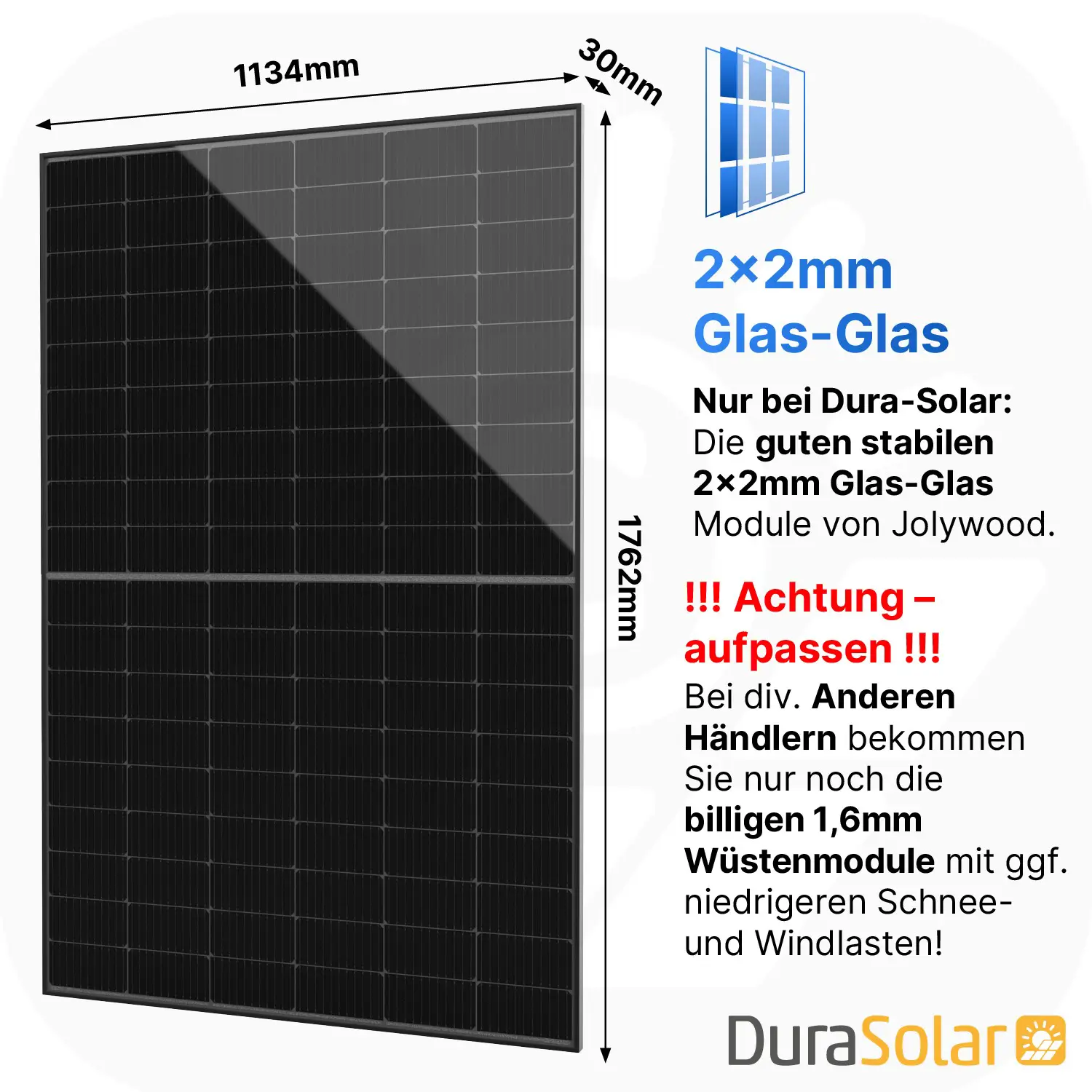 Nur bei Dura-Solar: Die guten stabilen 2x2mm Glas-Glas Module von Jolywood.