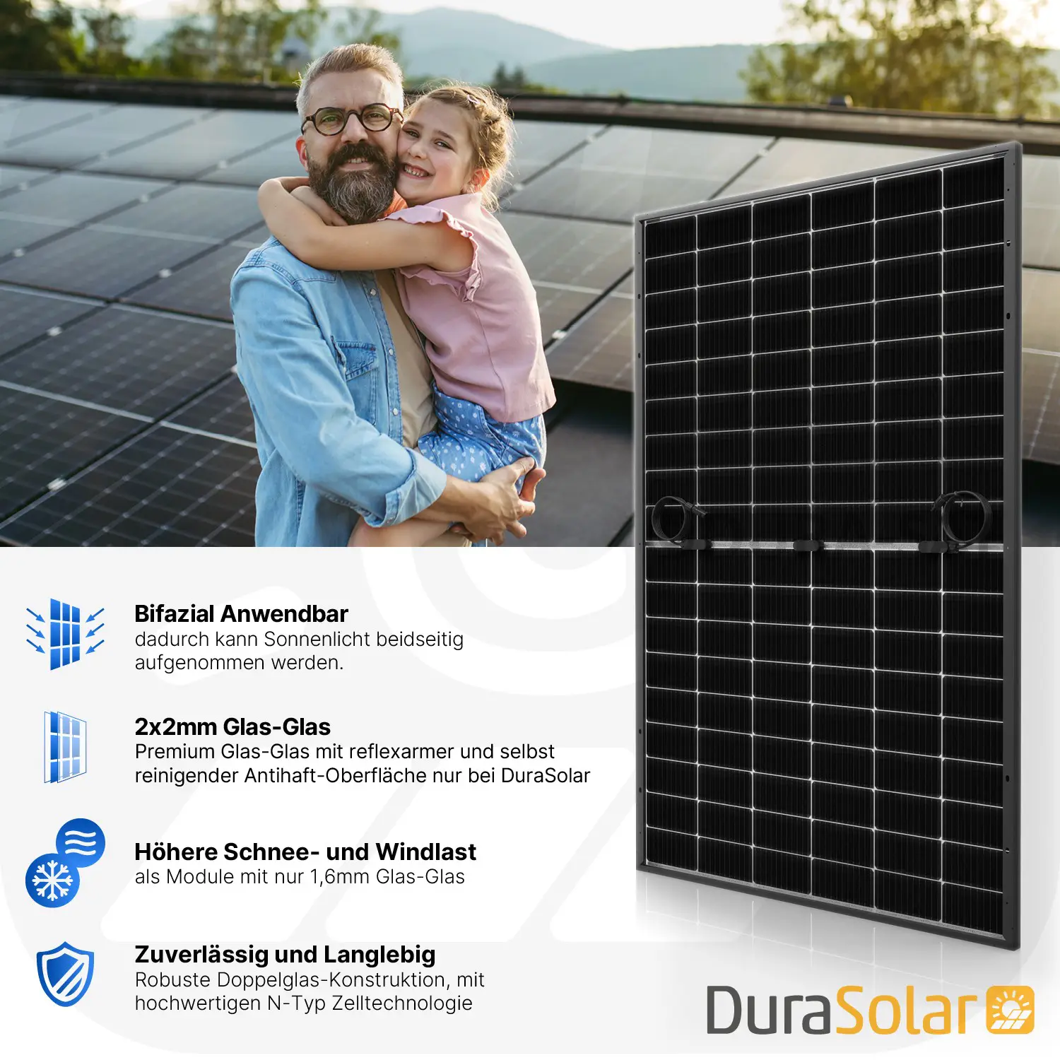 - 2x2mm Glas-Glas - Premium Doppelglas mit reflexarmer und selbst reinigender Antihaft-Oberfläche nur bei DuraSolar