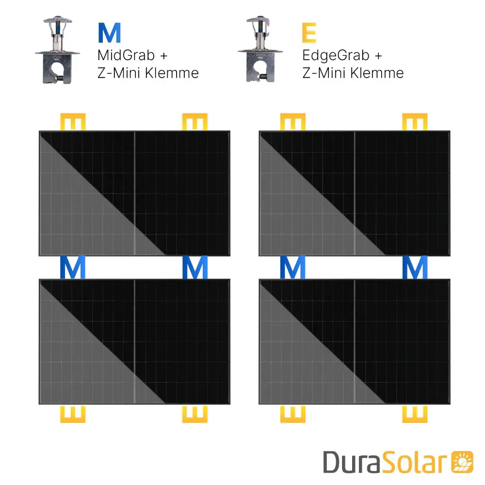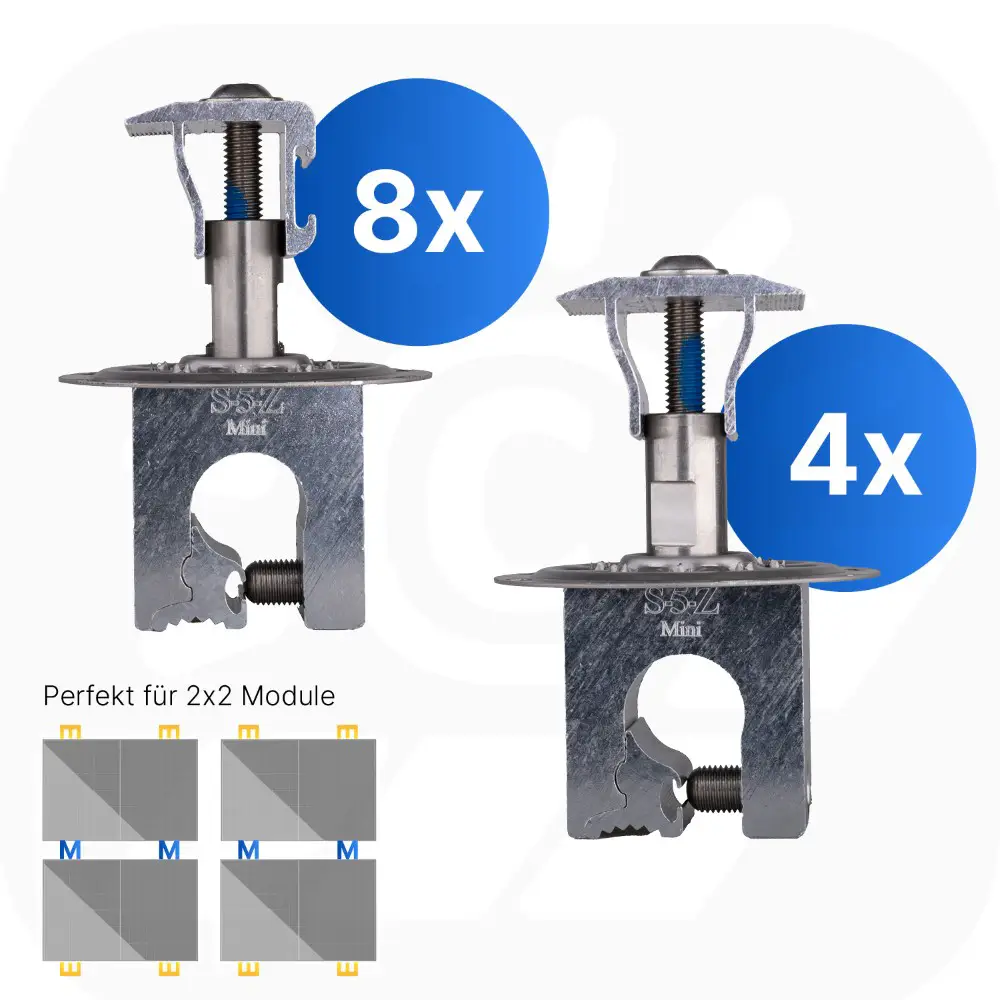 - Mittel und Endmodulklemmen inklusive Modulauflagescheiben aus Edelstahl und Erdungszähnen